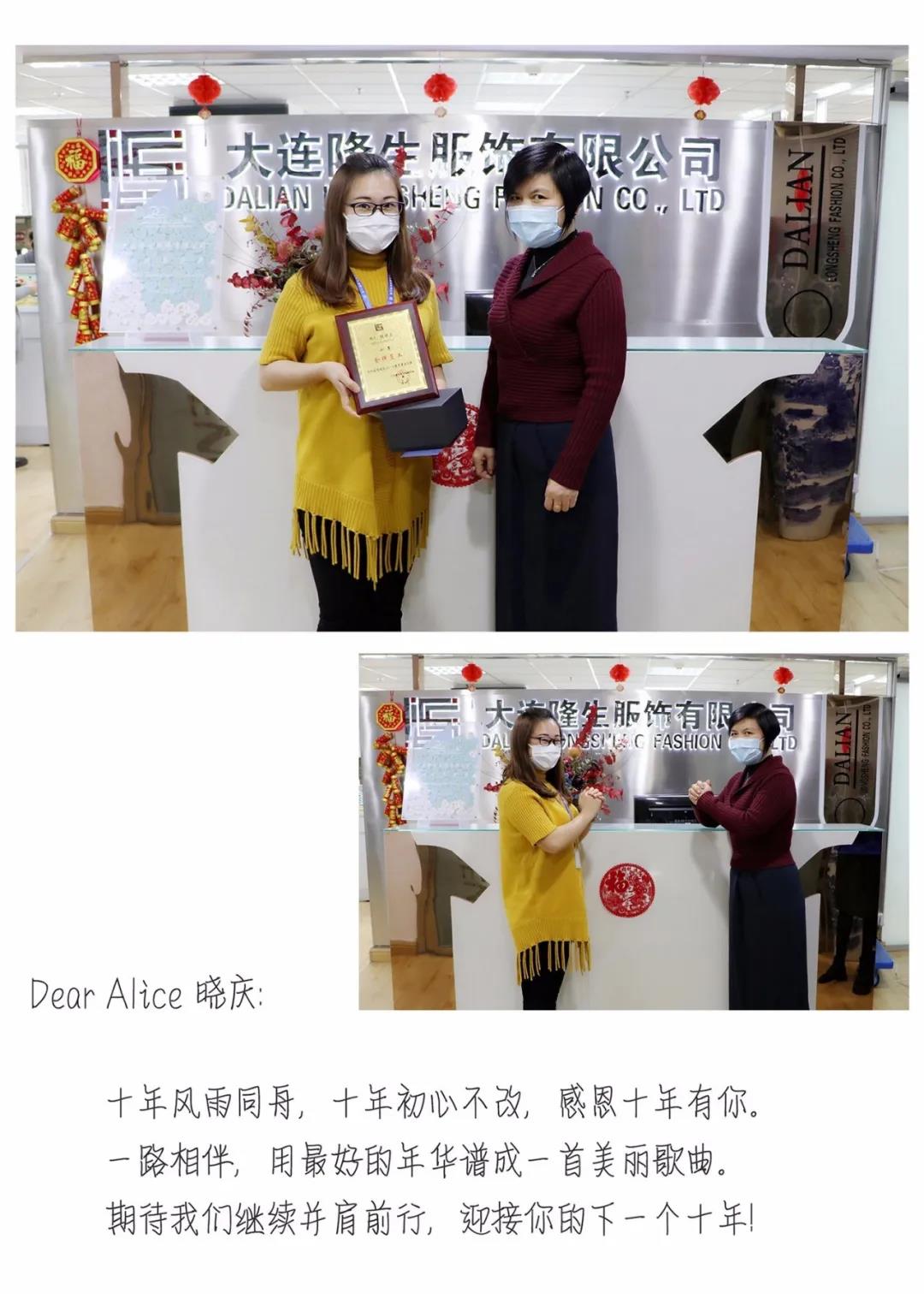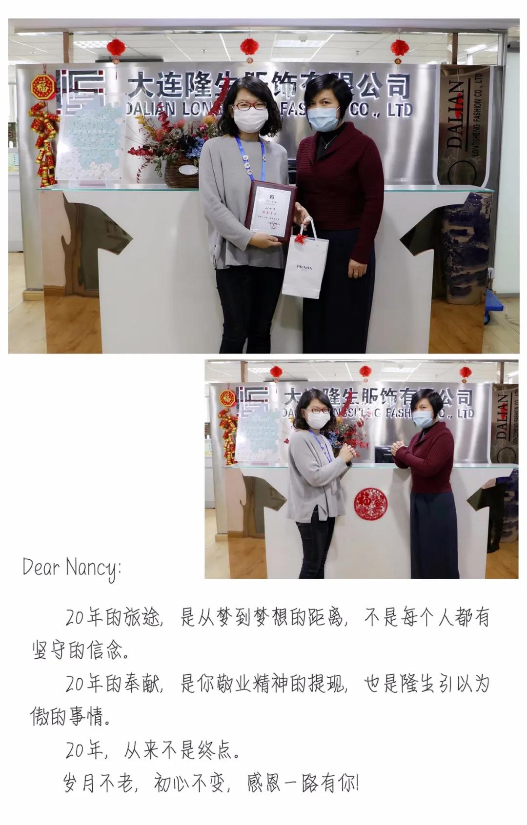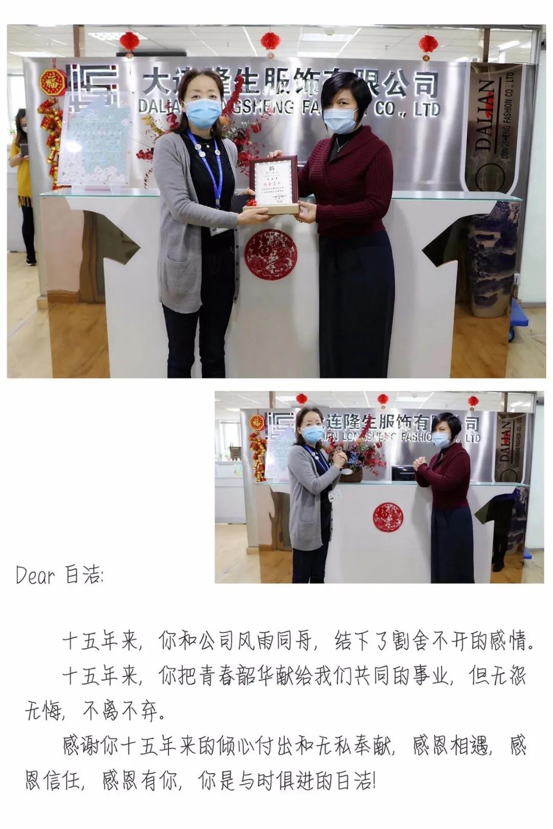 今天,吳總和HR總監(jiān)張昕經(jīng)理代表公司,共同為幾位跨入20/15/10周年俱樂部的“巾幗英雄”頒發(fā)了紀(jì)念獎(jiǎng)。禮不輕,情更重,隆生隔絕疫情,不隔絕愛!